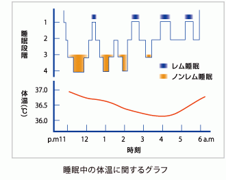 深部体温は、午前4時~5時頃に最低になります。体温が低くなると、浅い眠りである「レム睡眠」がたくさん現れて、起きる(覚醒する)準備が体の中で始まります。